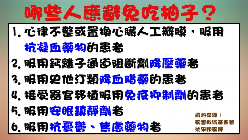 老人家對過高的藥物濃度承受力較低,又常是慢性病用藥的主要族群,許多慢性病藥物都是長效型,1天只要服用1次,血液中就持續有藥物濃度存在,即便相隔2小時再吃柚子或葡萄柚,仍可能會影響藥物作用,建議應儘量避免食用;可能與葡萄柚和柚子產生交互作用的藥物很多,民眾用藥前應詳閱藥袋上說明,如有疑惑可詢問醫師或藥師,服藥期間有不尋常的症狀應馬上就醫。
