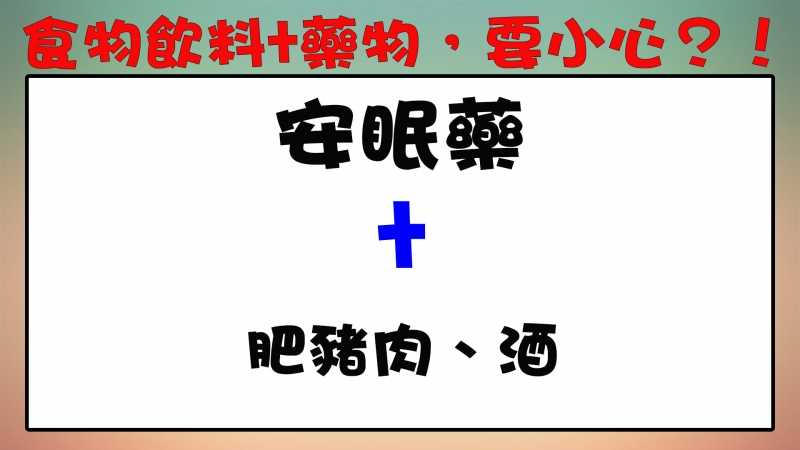 安眠藥要避免和高脂肪食物(如肥豬肉)一起服用,因為高脂肪食物可減緩藥物之吸收,使病人誤以為催眠劑量不夠而反覆服用,造成服用過量、藥物中毒之危險;酒精也會加強安眠藥的藥效,增加危險性。