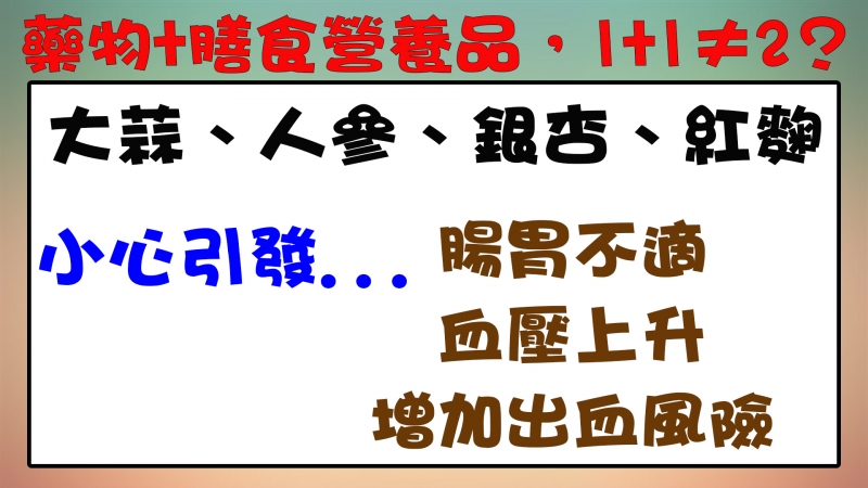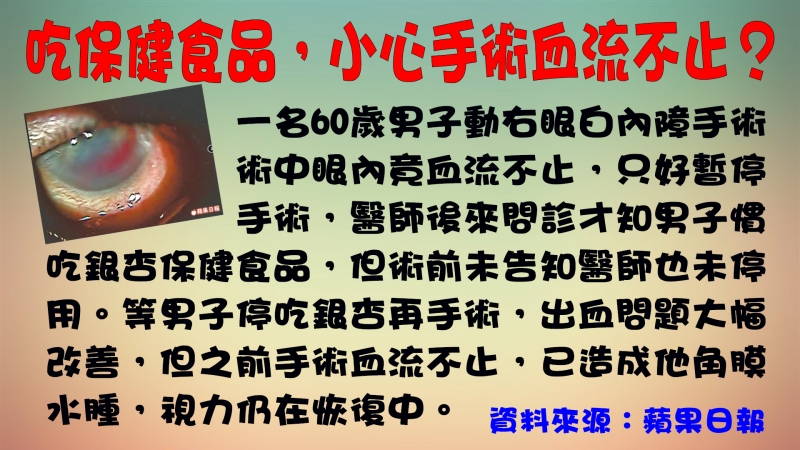 國人愛吃保健食品,卻不知道會跟藥物產生交互作用,令人擔心。之前媒體有公布一項調查,發現高達九成以上的民眾不清楚食物跟藥品也有交互作用。不少老人家,會吃銀杏保健品,防失智、防中風及心血管疾病,銀杏保健食品,有可能讓手術血流不止。