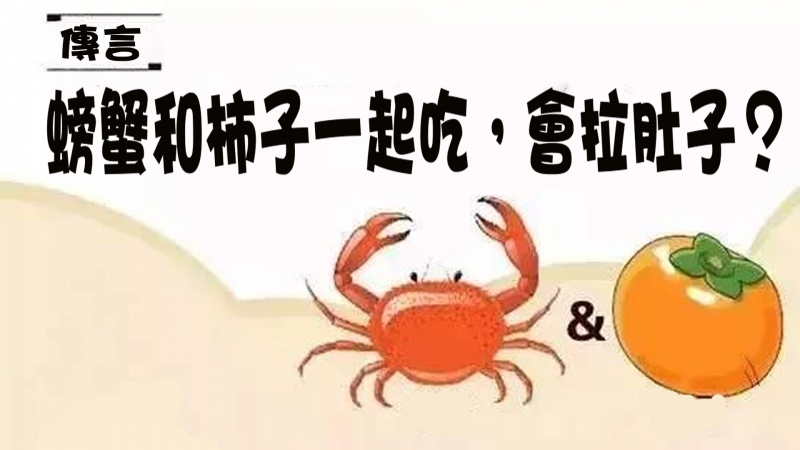 目前是柿子盛產期,但在傳統的農民曆食物相剋圖表中,吃柿子再吃螃蟹會中毒,長輩們也口耳相傳這項吃的禁忌。專家指出,其實柿子含豐富的單寧酸,如果同時食用高膽固醇的食物,就會凝固卡在腸子裡,腸道不通而出現腸絞痛症狀,並不是真的中毒。