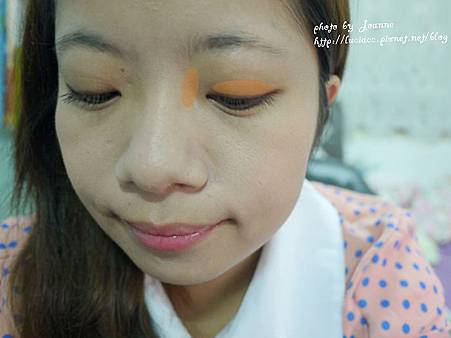 沾些橘色腮紅斜斜的往太陽穴畫去