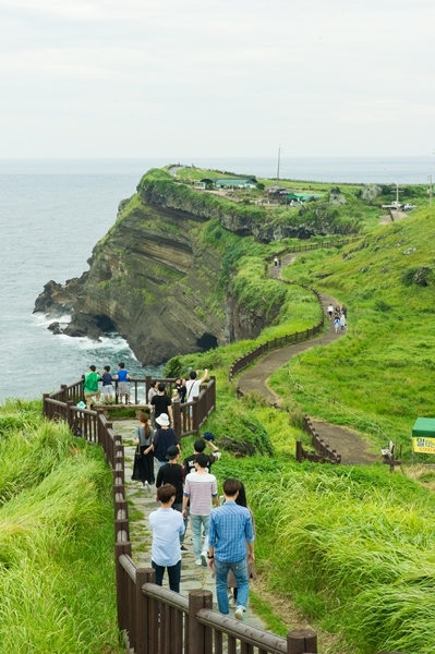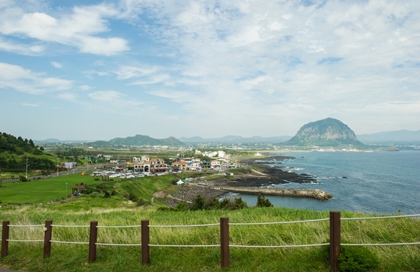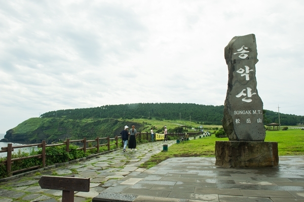 車子穿越蜿蜒在田野與森林之間的景觀道路,百萬年前火山活動形成的錐狀小山一個接一個地出現在車窗外,當靠近島嶼西南部海岸時,壯麗的山房山彷彿拔地而起,加上龍頭海岸、松岳山、兄弟島,使得西南部海岸風光格外綺麗多變,尤其是冬末春初油菜花盛開的季節,山房山一帶金黃色的花海襯著巍峨山景與海色,難怪會吸引許多韓流影視節目來此拍攝取景,尤其是松岳山,像是《大長今》、《All in》都曾在此拍攝,因此成為韓劇迷們來濟州島必至的朝聖景點