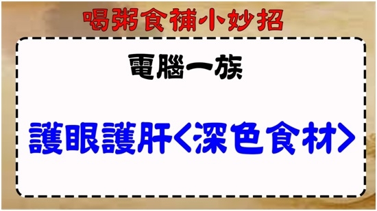 電腦一族由於電腦辦公、看書或看電視等長時間過度用眼,常會產生眼睛疲勞,可在粥裡加些護眼食物,如深色的大黃米、小米、黑米、紫米、枸杞、胡蘿蔔等,深色食材中含有的類胡蘿蔔素在人體能轉化為維生素A,有益眼睛健康,而黑米和紫米含有大量的花青素,能抵抗眼睛衰老。
