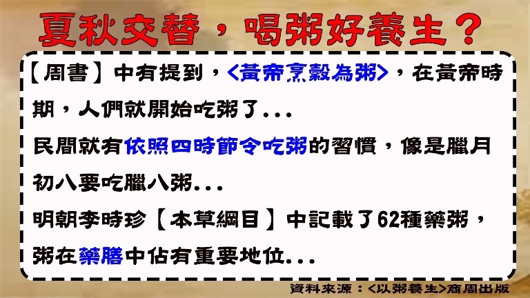 秋天是保護腸胃的關鍵時期,早上喝粥就是一個簡單易行的方法。古人認為「晨起食粥,推陳致新、利膈養胃,生津液,令人一日清爽」。所以說,早餐喝碗粥能潤燥滋陰、健脾胃、補中氣的功能益於養生。<�周書>中有提到,【黃帝烹穀為粥】,在黃帝時期,人們就開始吃粥了,粥在藥膳中更是佔有重要地位,不管是吃慣大魚大肉的達官貴人,或是粗茶淡飯的百姓,想要保健養生,都少不了粥品,一直以來,民間就有依照四時節令吃粥的習慣,像是臘月初八要吃臘八粥;夏日酷暑要吃清熱解毒綠豆粥,秋天乾燥就要吃些滋陰潤補的銀耳粥。明朝李時珍本草綱目中記載了62種藥粥,包括小米粥、糯米粥等各種穀類粥品,雜糧果實也能入粥,像是赤小豆、綠豆、藝人、蓮子、芡實等