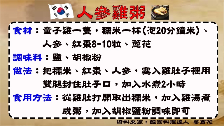 - 做法:把糯米、紅棗、人參,塞入雞肚子裡用雙腿封住肚子口,加入水煮2小時