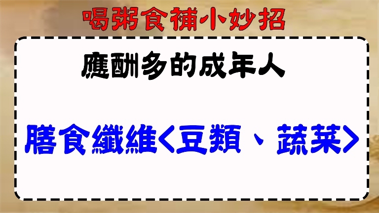 成年人尤其是男性同胞一到中年,很多都面臨體重增加的問題。長期坐辦公室活動量少,很容易囤積脂肪,而且平時免不了喝酒應酬,對肝臟和腸胃功能都不利。對於這類人群,可以在粥中加入雜豆(如紅豆、綠豆)及蔬菜等,增加膳食纖維的攝入,有利於脂肪、膽固醇代謝,同時也能保持血糖穩定。