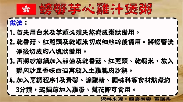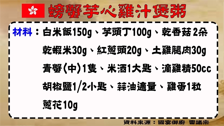 - 食材:白米飯150g、芋頭丁100g、乾香菇2朵、乾蝦米30g、紅蔥頭20g、土雞腿肉30g、青蟹(中)1隻、