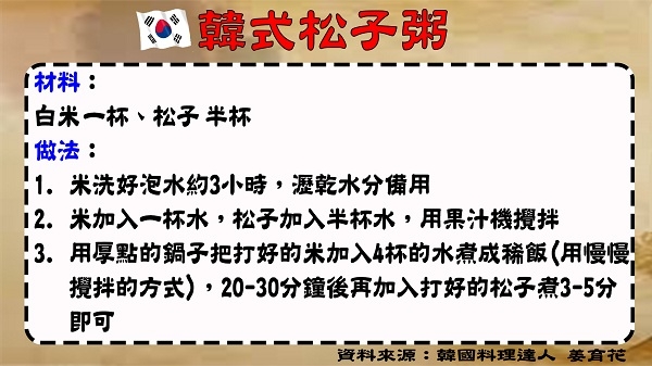 - 用厚點的鍋子把打好的米加入4杯的水煮成稀飯(用慢慢攪拌的方式),20-30分鐘後再加入打好的松子煮3-5分即可