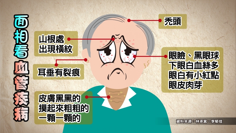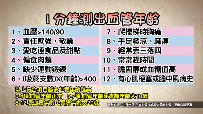 以上符合項越多血管年齡越高,0-4項者血管年齡正常;5-7項者,血管年齡比實際年齡大10歲;8-12項者,血管年齡比實際年齡大20歲。