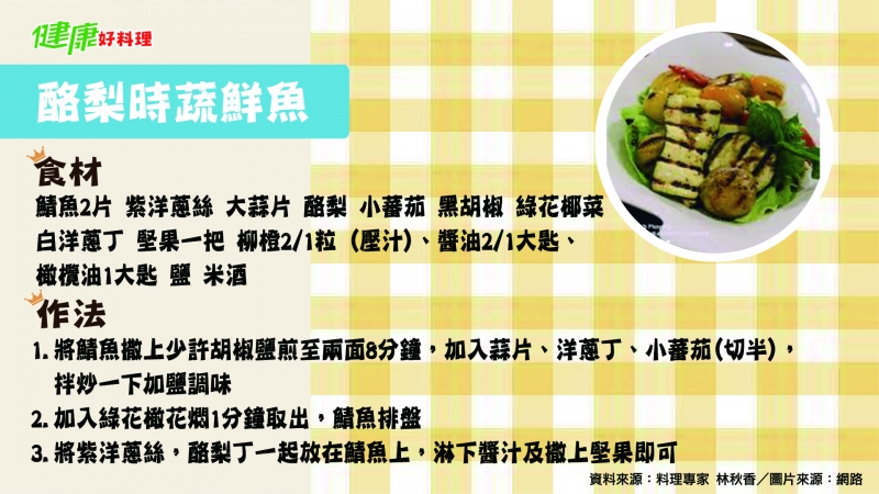 鯖魚2片 紫洋蔥絲 大蒜片 酪梨 小蕃茄 黑胡椒 綠花椰菜 白洋蔥丁 堅果一把