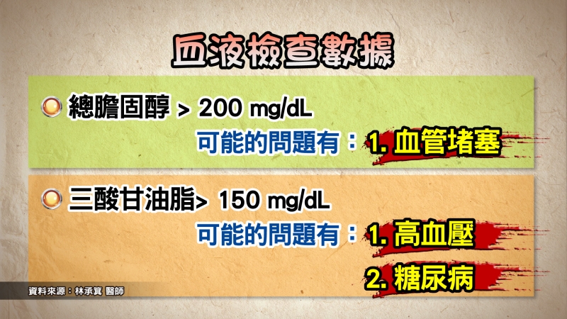 - 三酸甘油脂> 150 mg/dL可能的問題有: 1. 高血壓 2.糖尿病