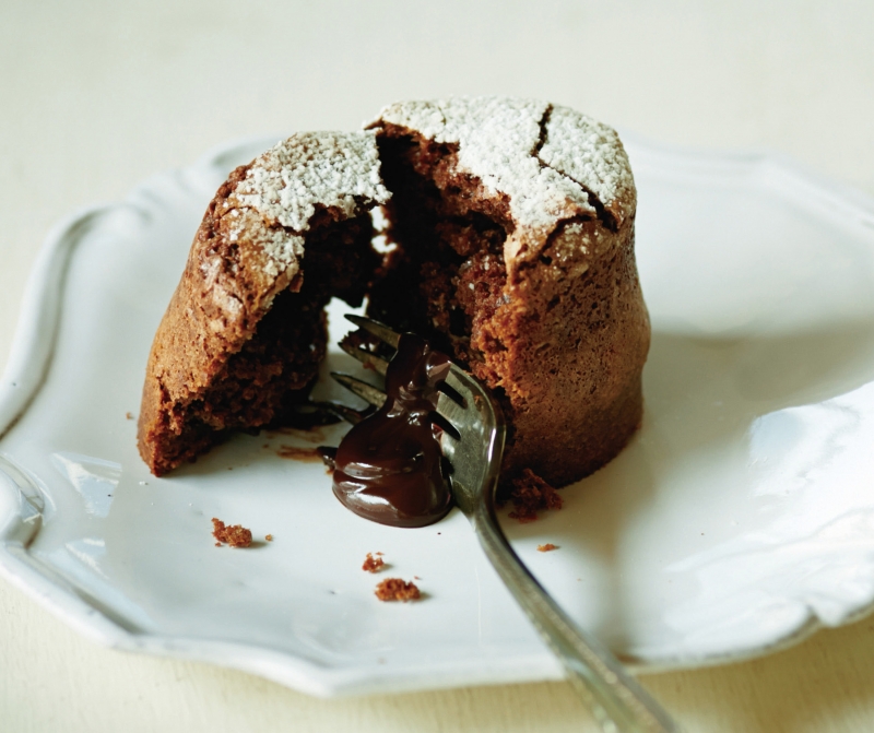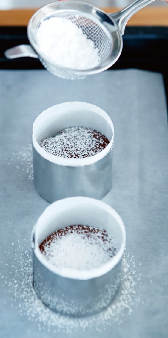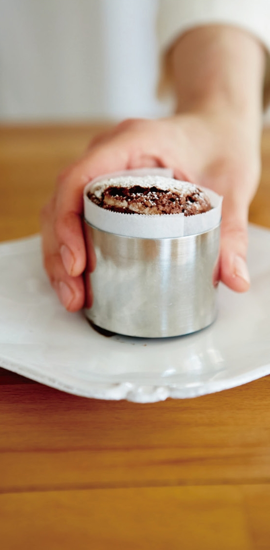 10. 烤好後立刻移到盤子上,脫模並撕除烘焙紙。蛋糕如果冷掉了,可放進500w 的微波爐中加熱 10∼20 秒, 蛋糕裡頭的甘納許就會再次變得柔滑。