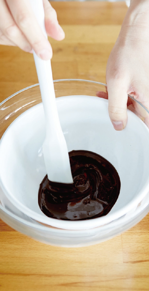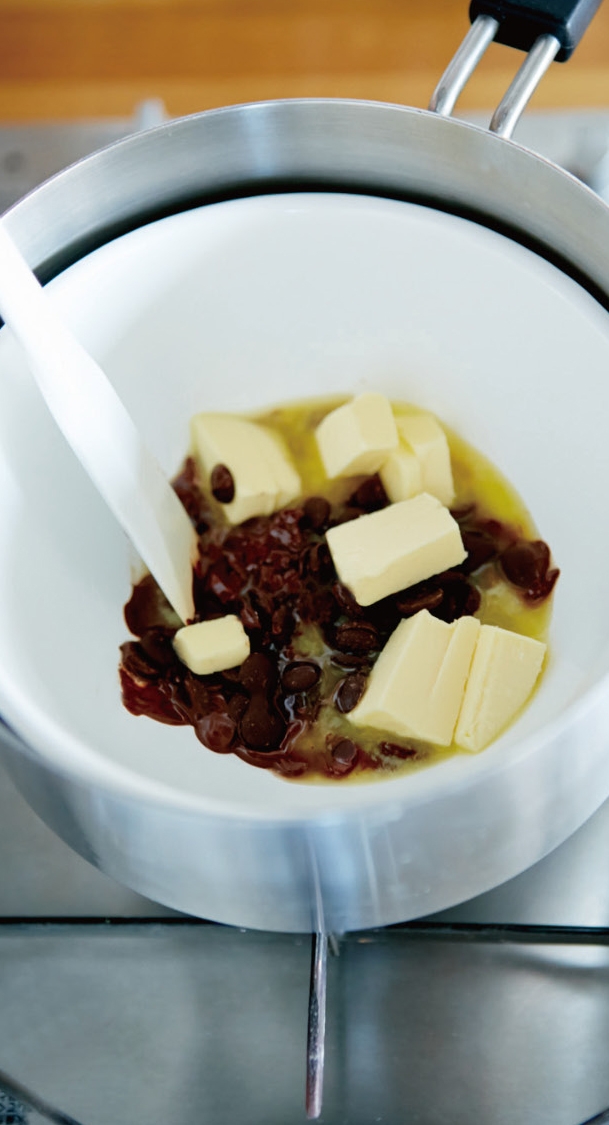 5. 將無鹽奶油加入放著巧克力的碗中,隔著熱水攪拌至溶化。
