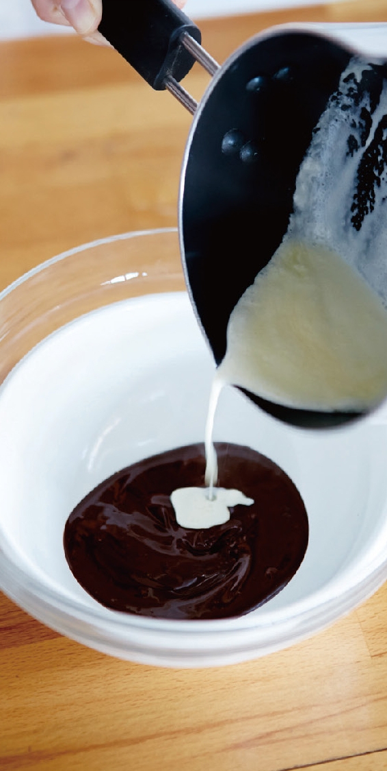 1. 製作甘納許。將巧克力放在 60℃ 的熱水上隔水溶解。如果用沸水來溶解,會使巧克力油脂分離並結塊,請多加留意熱水的溫度。