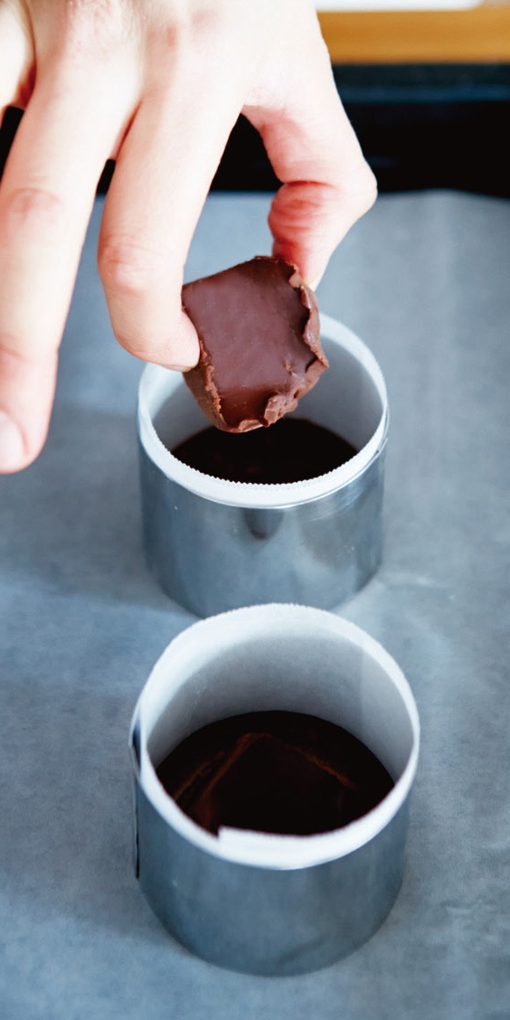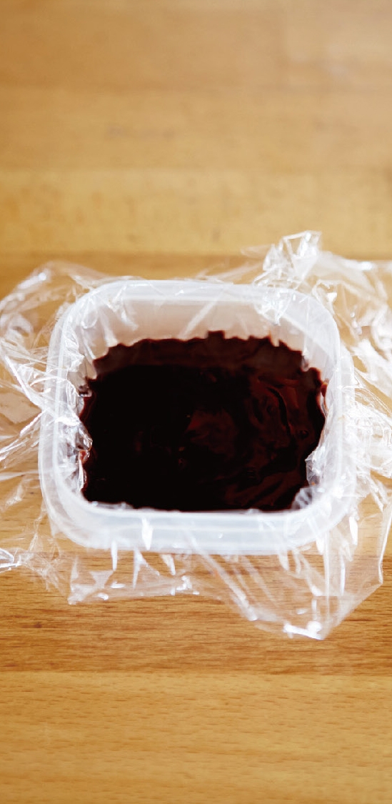 3. 將 2 倒入盛裝甘納許的容器中, 再放進冰箱冷藏 3 0 分鐘至凝固。
