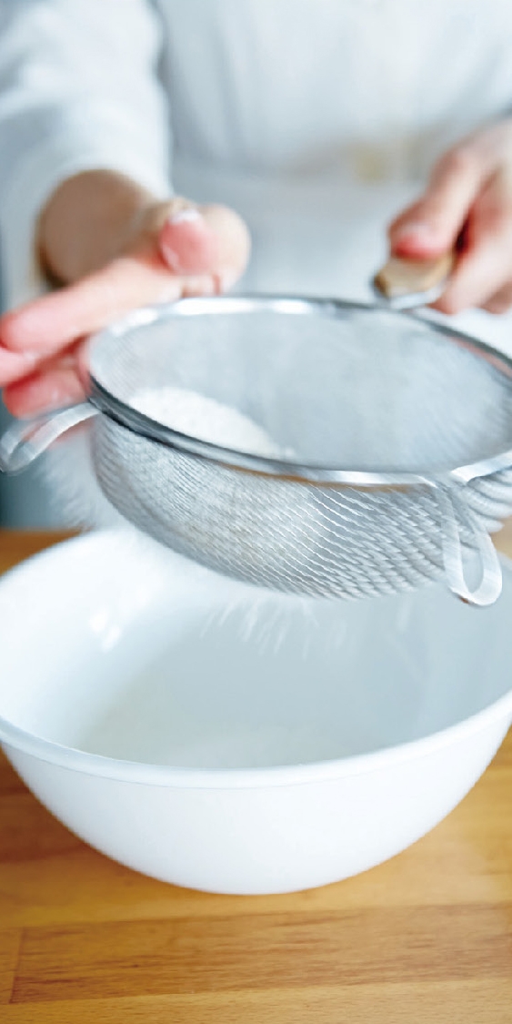 4. 將烤箱加熱至 180℃。將低筋麵粉、泡打粉一起篩進放著細砂糖的碗中,
