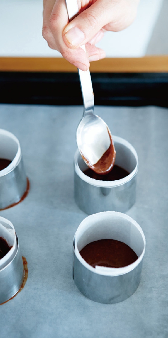 1. 無底圓形模 4 個( 直徑 6cm):先將烘焙紙鋪在烤盤上, 再放上無底圓形模。無底圓形模的內側面也都要鋪上烘焙紙。