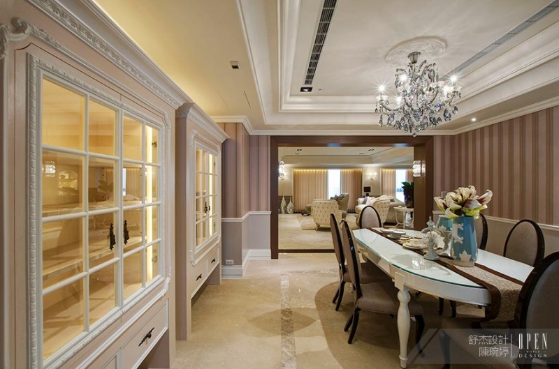 從玄關處的白底黑色塊直至餐廳素雅的大理石地板,Debby打破空間隔閡的限制,僅以地磚色塊劃分場域使空間動向更為流暢。寬敞明亮的餐廳空間,配合現代水晶吊燈形塑高雅的法式新古典氣息,粉膚色的立櫃透顯溫潤的暖黃光源,彷彿展示人文藝品的展間替空間增添溫柔雅緻的氛圍。