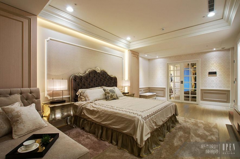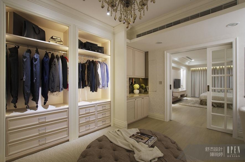 主臥室將空間劃分為臥室及更衣間,並以拉門式落地格子門作為分界,格子門既分隔兩處而通透的設計亦使視覺得以延伸穿透。無論是玄關、客廳或是臥室皆依循了此案優雅和諧的設計語彙。徒有好設計還不夠完整,屋主陳太太Annie稱讚到由 Debby & Jay 帶領的設計工程團隊,至今是他們看過最有素質及秩序的團隊。而在此案中,舒杰室內裝修設計有限公司 Debby 陳琬婷 以其擅長的法式優雅風格,沒有過於裝扮的貴氣而是以內斂淡抹的高雅質感鋪陳空間,替案主塑造優雅知性的生活樣貌,淡淡流瀉出一抹悠然自得的氛圍。