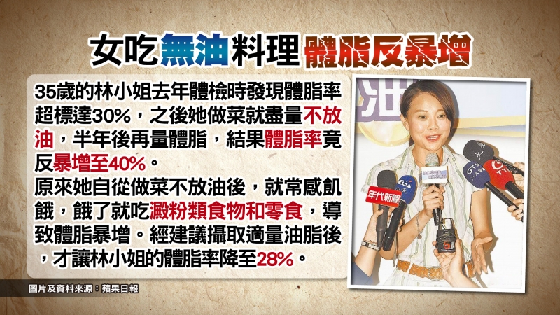有一位35歲的林小姐去年體檢時發現體脂率超標達30%,之後她做菜就盡量不放油,半年後再量體脂,結果體脂率竟反暴增至40%。油脂攝取不足會讓人更容易餓,因此吃下更多澱粉類食物,尤其是高熱量的零食,加上澱粉類食物消化快,惡性循環下,使體脂不減反增。通常完全不吃油的人,會吃兩種東西取代:一、水果,二、澱粉類食物。前者會使三酸甘油脂增加,後者會提高體脂率。