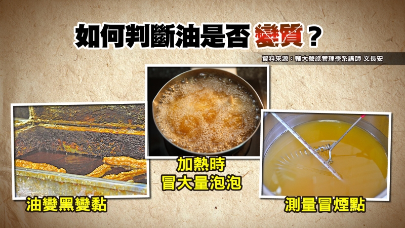 油變巧克力色 有油耗味 就表示變質了 但動物油變色比較慢,所以最好用一遍就好。油炸過的蒜頭油、紅蔥頭油、蔥油、香料油建議是不要再高溫油炸、可以用於低溫烹調方式,炸油變黑變黏了,或是加熱時冒出很多泡泡,就表示應該換油了,但還有另一種更科學的方法,就是新油買來,第一次使用,先用溫度計測量它冒煙的溫度,若油炸多次之後發現,冒煙點的溫度突然降低20度,就表示該油已經裂變了,該換油了。