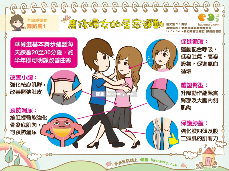 許多產後婦女都會認為自己身材走樣,且「性福感」似乎不復從前,其實,跳舞就有助改善!東南亞職業摩登舞冠軍陳媦娟老師表示,像是國標舞中的華爾滋不僅是很好的運動,且舞蹈中許多縮肛提臀的動作不僅可以強化骨盆底肌群力量,幫助改善尿失禁,連帶還能增加性福感唷!