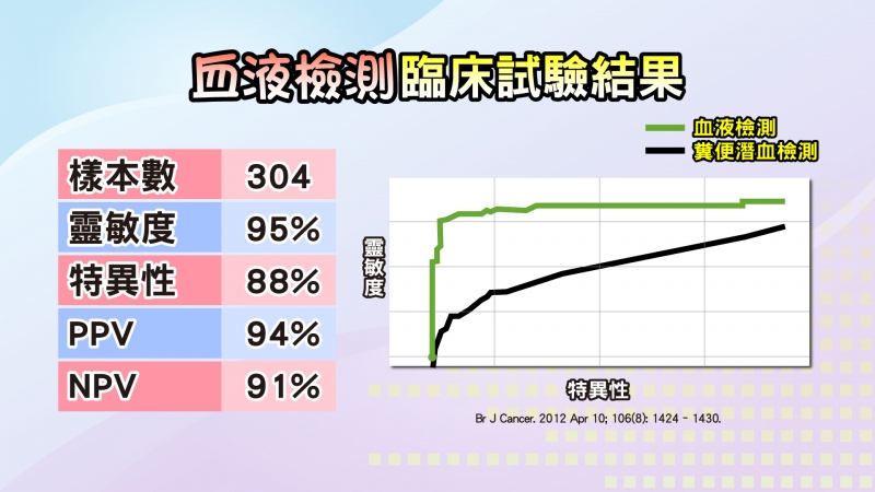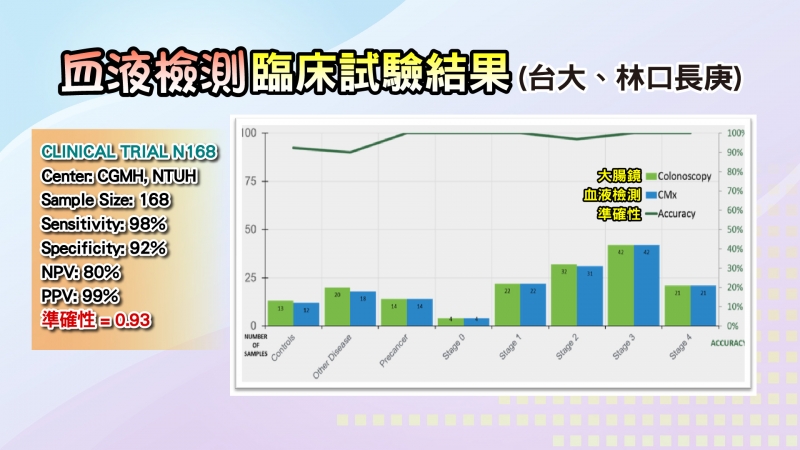 從準確性來看,根據林口長庚臨床試驗的結果,顯示血液檢查的敏感度有95%,專一性有88%。比現有各種檢測都來得好很多。實驗也證實,我們的血液檢測結果和大腸直腸鏡的檢測結果幾乎完全一樣準確。
