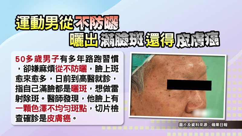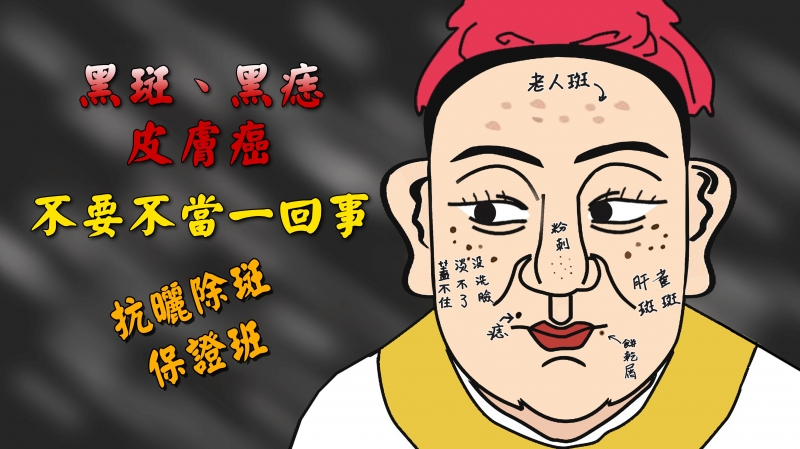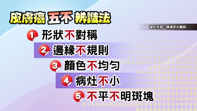 5不辨識法:皮膚出現1. 形狀不對稱、2. 邊緣不規則、3. 顏色不均勻、4. 病灶不小、5. 不平不明斑塊