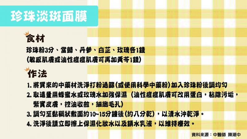 材料:珍珠粉3分、當歸、丹參、白芷、玫瑰各1錢(敏感肌膚或油性痘痘肌膚可再加黃芩1錢)