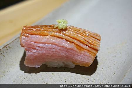 中後方較為粉嫩色系的是鮪魚中腹 , 料理長用他的神之刀法劃出細緻的紋路 , 除了要在冰鎮的時候品嘗