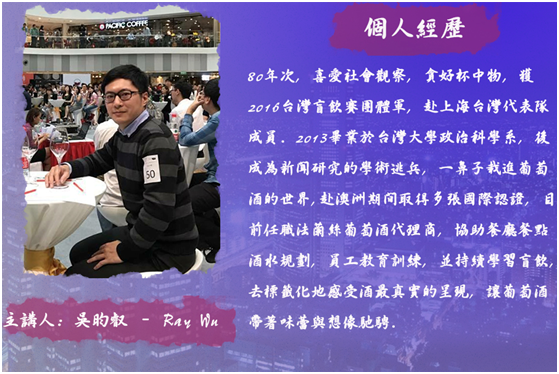 此次品酒會特別邀請法蘭絲葡萄酒代理商講師-吳昀叡,主講「薄酒萊。不只是新酒」,其個人對葡萄酒的豐富知識及經歷,屆時將讓貴賓們徜徉在葡萄酒的迷人韻味中,並可以用超低優惠價將今年最清新的薄酒萊帶回家!