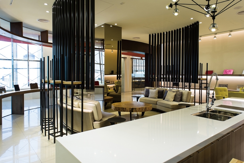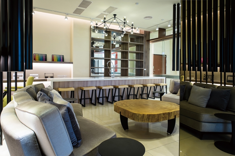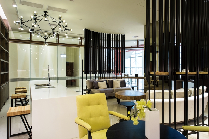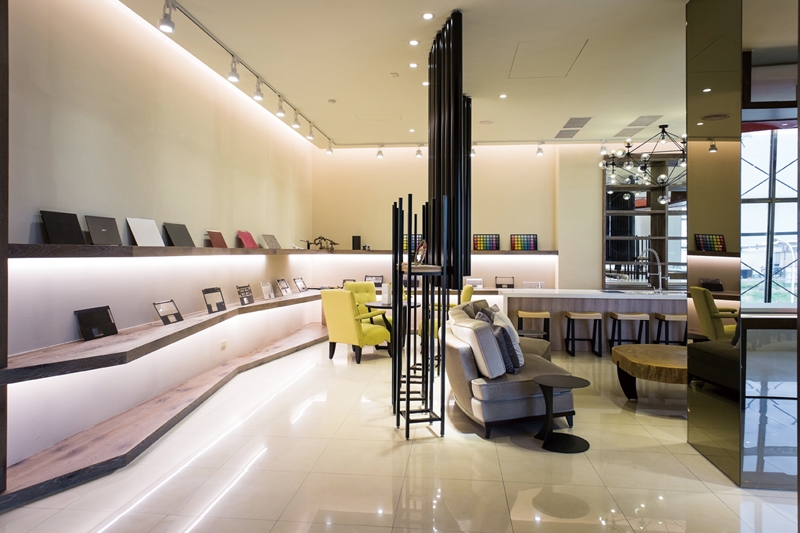 自然元素與重色金屬拼貼出輕工業風的細節,鐵灰金屬展架、梧桐木厚片鋼刷木紋共構展示檯面,上、下展檯錯位的手法,客人在沙發區即可環顧觀賞所有展示樣品。另外,出於款待每一位貴客的殷切好意,特別規劃一座長邊近6公尺的中島式檯面,可直接現場烹飪,分享美食;並搭配12張橡木座面鐵灰色金屬骨架高腳椅,串聯縱向空間軸,過道上設置了樣品展示櫃與展示平台,側邊一隅另有三人座位區,讓貴賓及家屬可先在此休憩-即「展示好心情」的用意。設計師意欲營造的是一種感性氛圍,「藉由整體環境中的光點渲染,創造金屬素材的新穎感覺,兼具現代與自然的空間,並無太多繁瑣的元素牽絆,讓光照、材料的價值獨立呈顯。轉身之間,皆有笑語交織。」