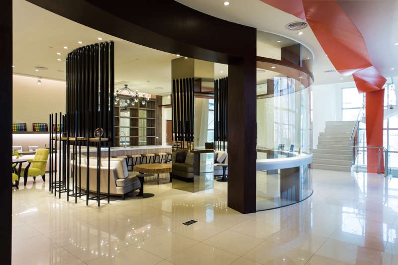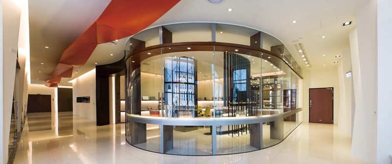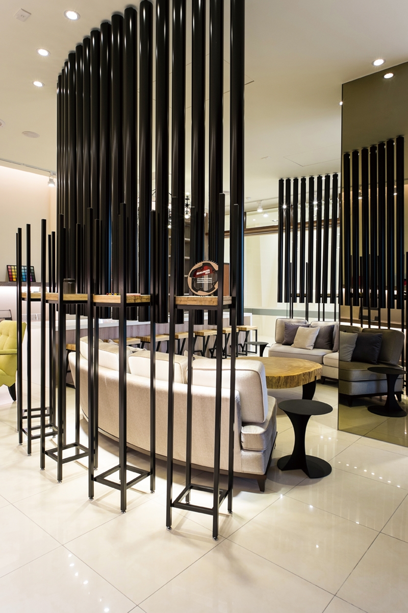 圓弧造型的玻璃帷幕首先界定出輕巧明快的空間性格,深色鋼刷木紋大門勾勒出輪廓,曲直毗接,虛實迴轉,接待空間與縱深廊道的內外聯繫遂得以通暢無礙,清透玻璃將穿梭走道的人影擷取為工作背景,亦宛若街角櫥窗,將內部場景的活力、展示產品的紛然分享於外。「以圓的意象向四方角落盡情的奔流,彷彿拱手作揖,層層分明,形成以中道思想為基礎,以禮為尊的待客之道。」設計師以沙發區為圓心,中島、過道、展示區、休憩區等單元向外擴散,主要對談區域自然形成空間的中心點;沙發區後方環繞著嵌入了LED燈的金屬黑管,自樓板與天花板懸垂而下,形構光牆,圍塑出嶄新的談話體驗。疏密、直列有致的金屬管光牆,對應於外圍結合洗牆燈光的展示台,柔和的漸層光暈之中,光影、靜物重疊,淘洗出微妙的視覺穿透感。
