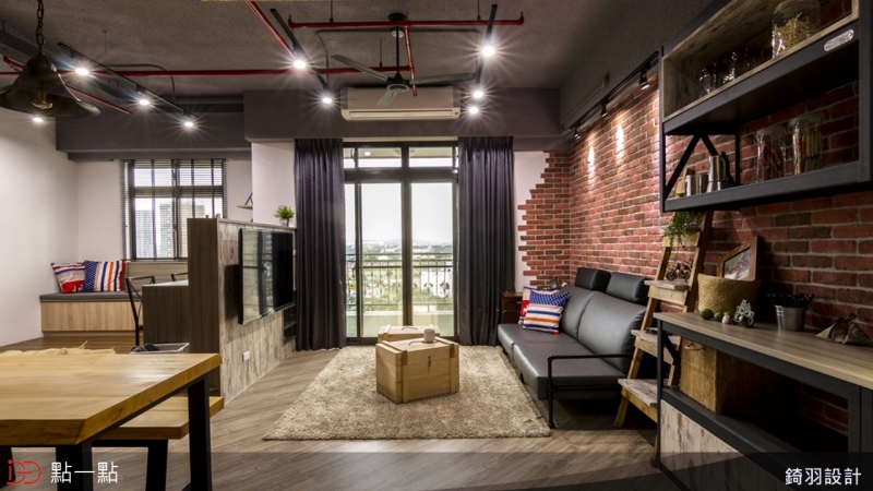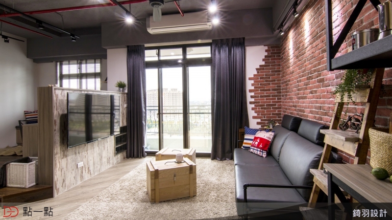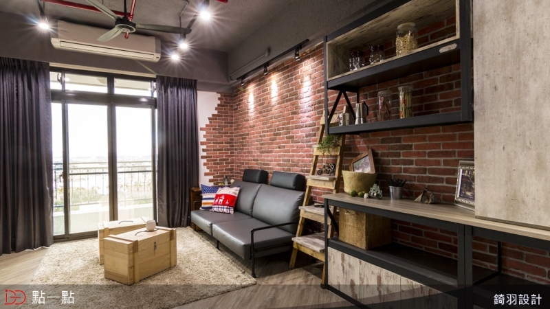 以紅色文化石磚牆與鐵件、再搭配仿清水模板料,加入灰色沙發,讓起居空間成為溫暖的 Loft 氛圍。