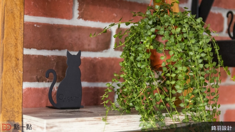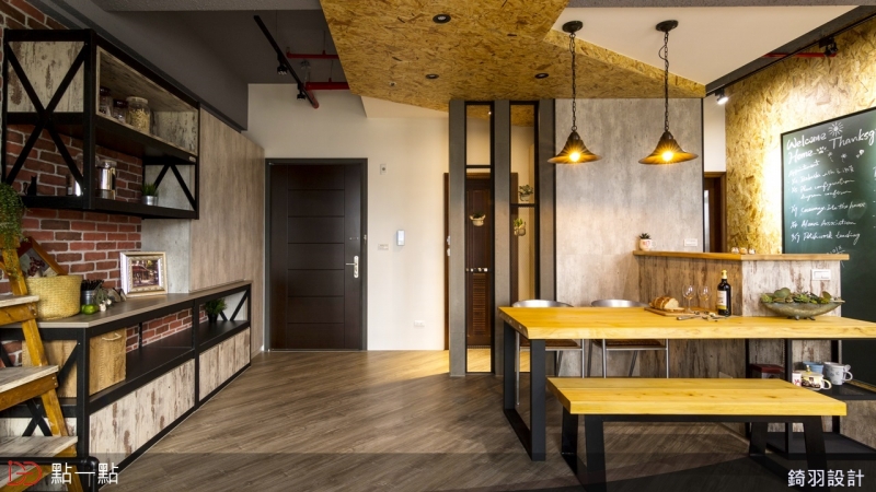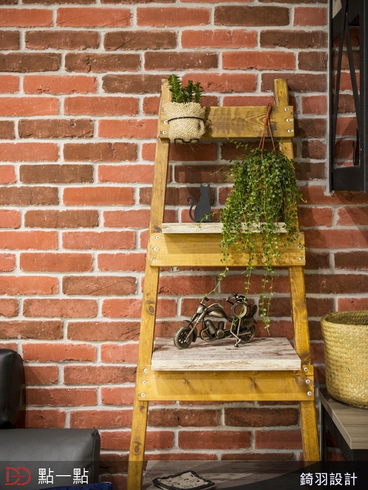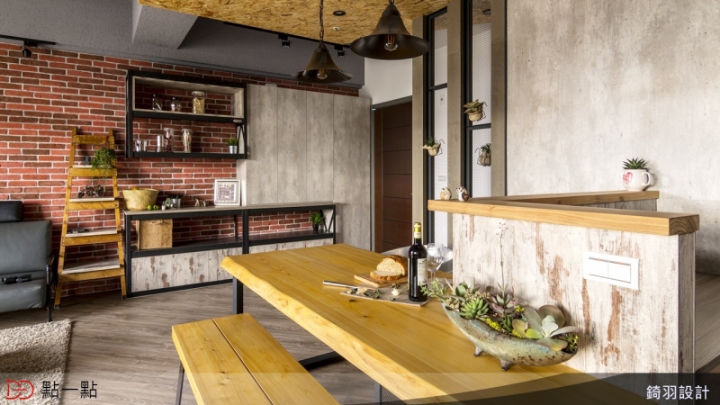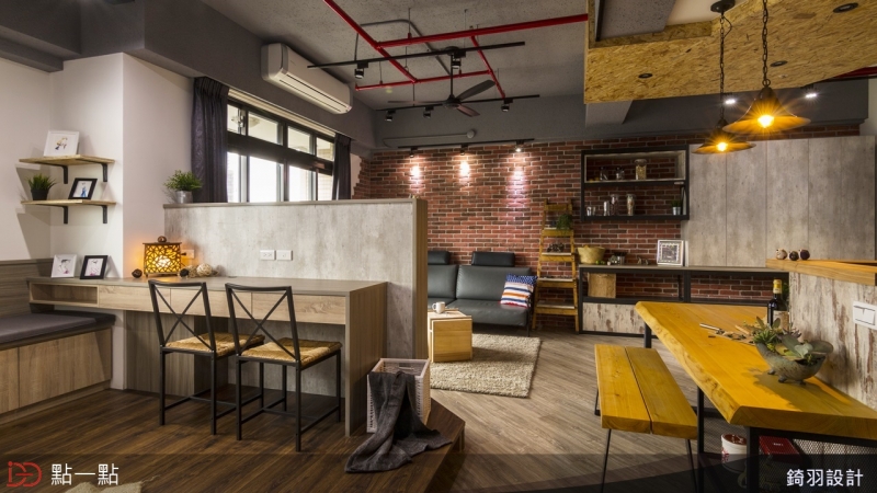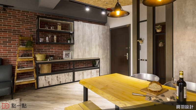 設計師將靠近客廳的房間牆面打通,規劃成開放式書房,讓人進入室內映入眼簾的是開闊的視覺感受;而在整體配色上,選用紅色文化石磚牆與鐵件、並搭配仿清水模板料,讓工業風更加溫暖。
