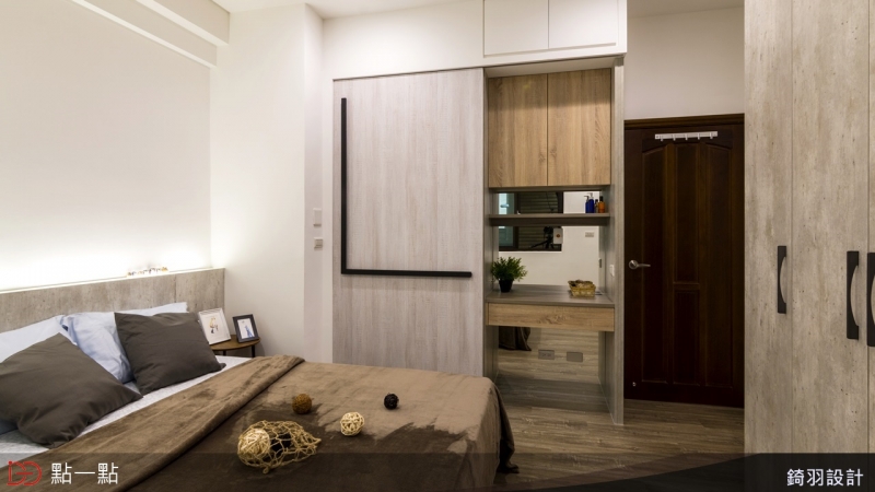 因廁所的門面對床頭,設計師設計拉門做為隔絕,並以旁邊的畸零空間規劃成化妝桌。