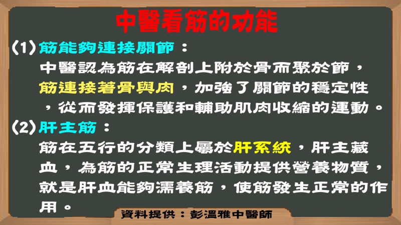 (2) 肝主筋:筋在五行的分類上屬於肝系統,肝主藏血,為筋的正常生理活動提供營養物質,就是肝血能夠濡養筋,使筋發生正常的作用。