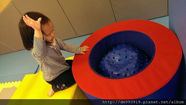 軟趴趴的球並不是消氣了唷!這是故意讓孩子陷在裡頭的