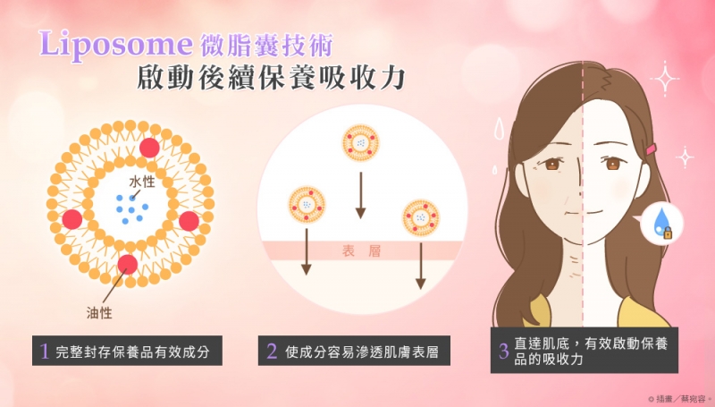 (Liposome微脂囊包覆技術將有效成分完整封存直達肌底,有效鎖濕抗老。 圖片提供/優活健康網)