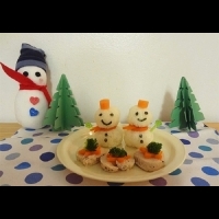 用蔬菜和火腿⋯⋯等做圍巾和帽子,再用義大利麵和海苔做成小手和鈕扣,可愛的小雪人就完成囉♡