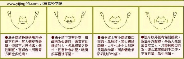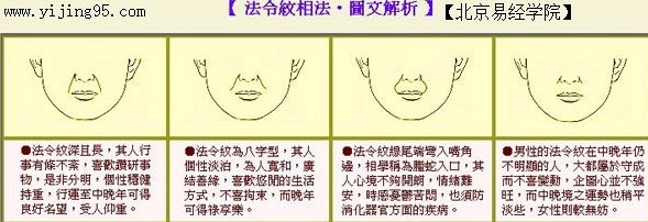 左右不齊的法令是雙重人格相;左右法令不整齊者,其性格也不均衡而具有雙重人格者居多.職業方面也無法長期定著于某項工作,而容易變換.如果左右的法令極端不整齊者,不具尊親緣而且體弱多病.女性的法令紋為寡婦相。這是女性較多,如形成為細紋狀而有兩條以上者,即是寡婦相.雖然同是寡婦相,但有的人則夫死而成為寡婦;有的人則離婚為原因。