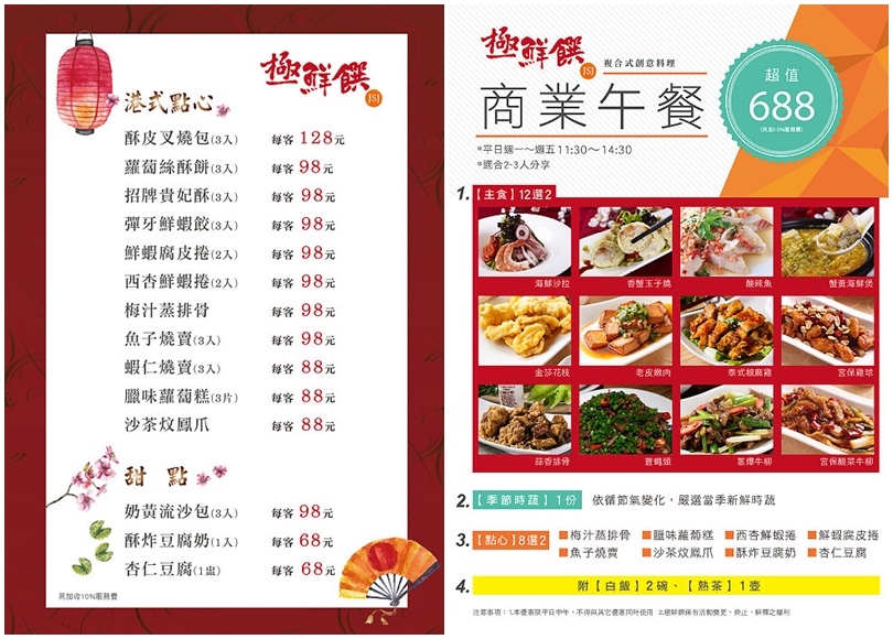 ▼平日中午也有提供商業午餐688元,適合2~3人分享,一整個相當超值!另外還有港式點心、甜點可供點選,想來點港點或是換個口味都沒問題唷!