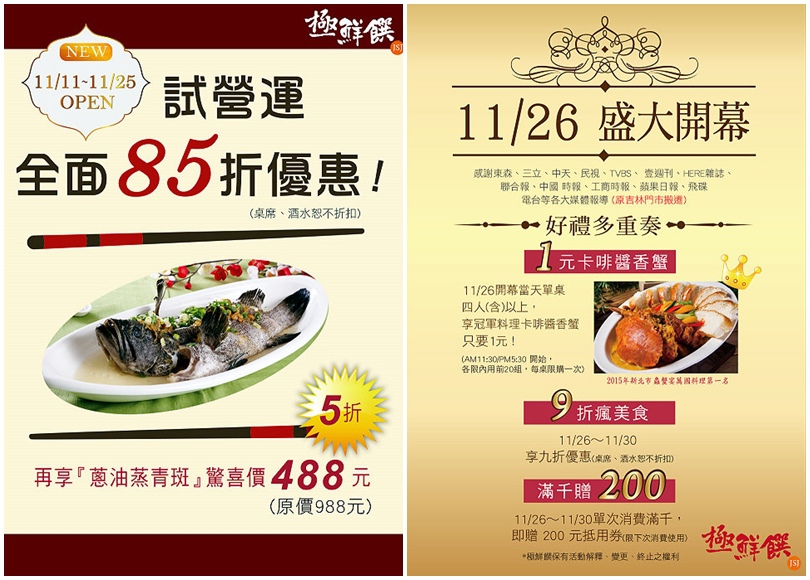 ▼試營運期間全面85折優惠,還可再用5折的價位享用蔥油蒸青斑的美味,真的是超划算!另外11/26開幕當天也可以參加1元享用卡啡醬香蟹(單桌四人以上)、9折優惠及滿千贈200元活動(以上活動詳細內容以店家公告為主),有興趣的朋友要來要快啊!