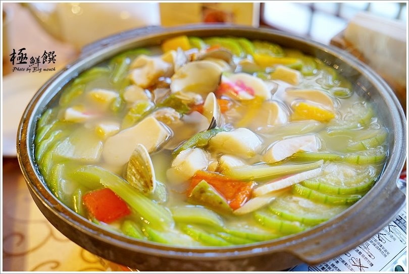 ▼陶板碧綠鮮貝(568元),裡頭有絲瓜、干貝、蛤蜊、甜椒、杏鮑菇、西洋芹、魚板等配料,看起來顏色繽紛又多元!