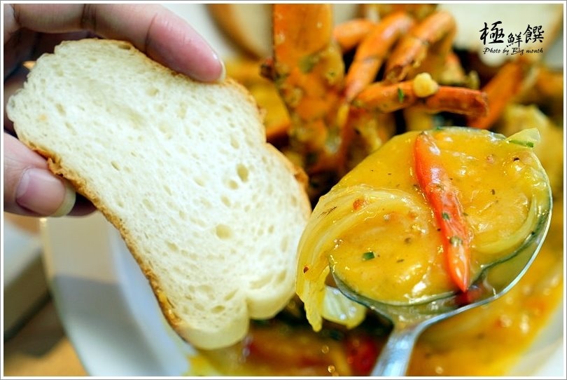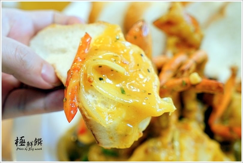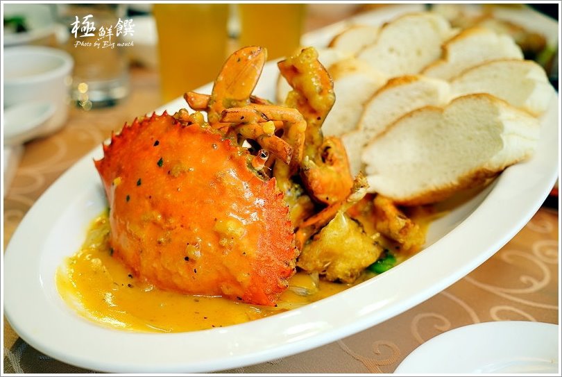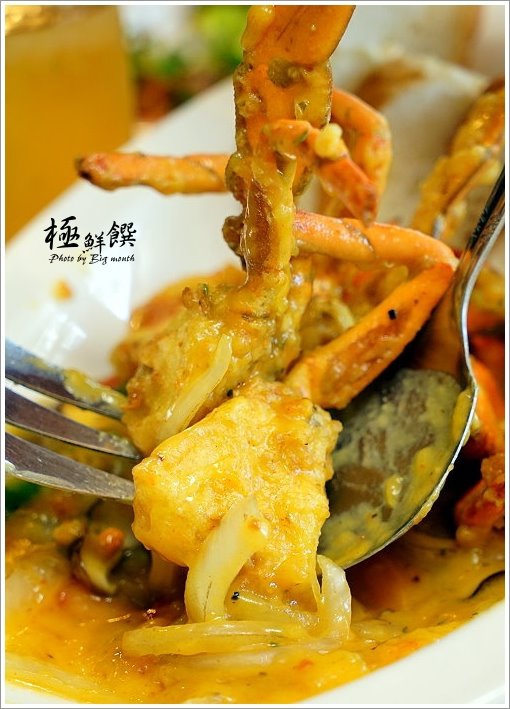 ▼卡啡醬香蟹(季節/888元),特別採用紅蟳下去炸過之後,再以洋蔥、鮮香菇、彩椒、蒜頭等配料爆香鋪底,接著再淋上以薑黃、茴香、奶油等辛香料熬煮而成的卡啡醬,一旁搭配特製軟法,就成了這一道澎湃的料理啦!