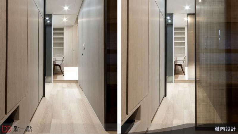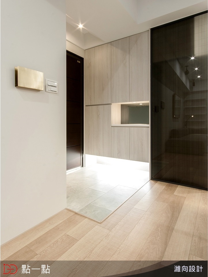 以木質牆櫃注入收納機能,搭配燈光效果的輔佐,開啟輕簡的入門印象。