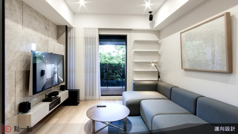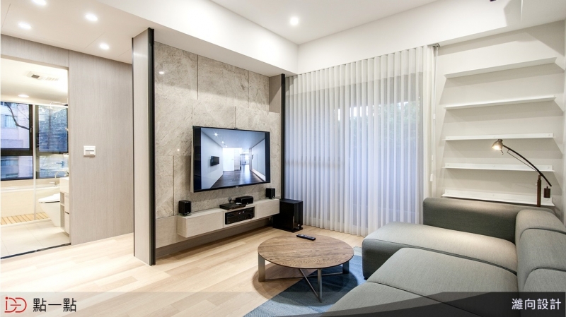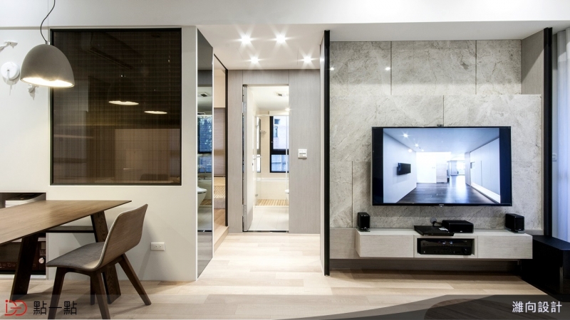 利用電視牆界定空間區域,讓客廳、廊道、浴室、主臥室,有所區隔。