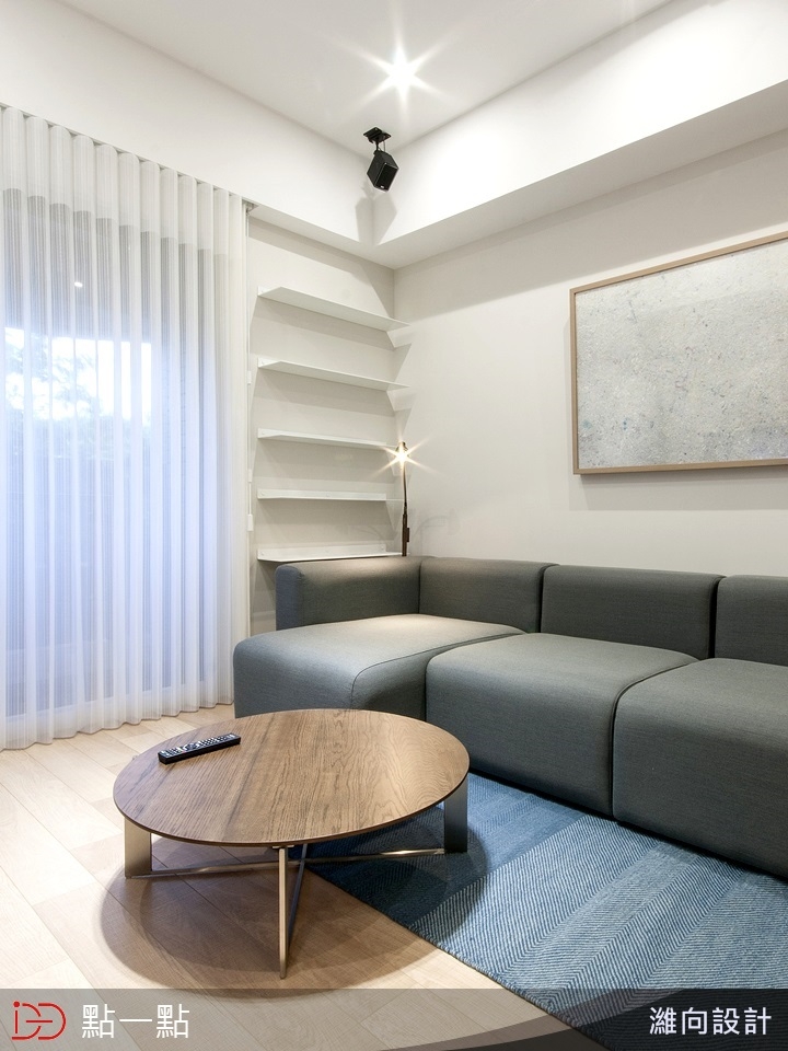 採用輕簡白調作為主色,藉此放大空間視野,偶爾點綴俐落的黑色線條,增添視覺上的立體度,牆面則加入層板或做出內凹收納空間,將機能融於簡練美感之中。