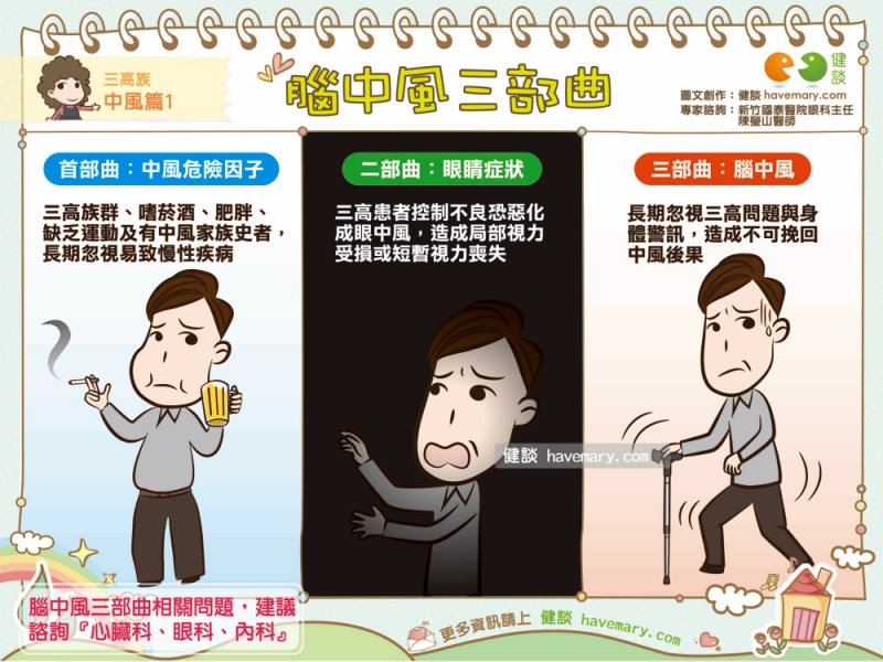 若三高問題未善加控管,惡化成眼中風亦未及時察覺與治療,就造成不可挽回的第三部曲「腦中風」。
