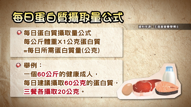 一般來說,正常成年人的每日蛋白質攝取量公式為「每公斤體重×1公克蛋白質」(附圖1),也就是說體重60公斤的人,每日蛋白質建議攝取量為60公克,即早、午、晚餐各20公克。